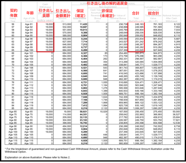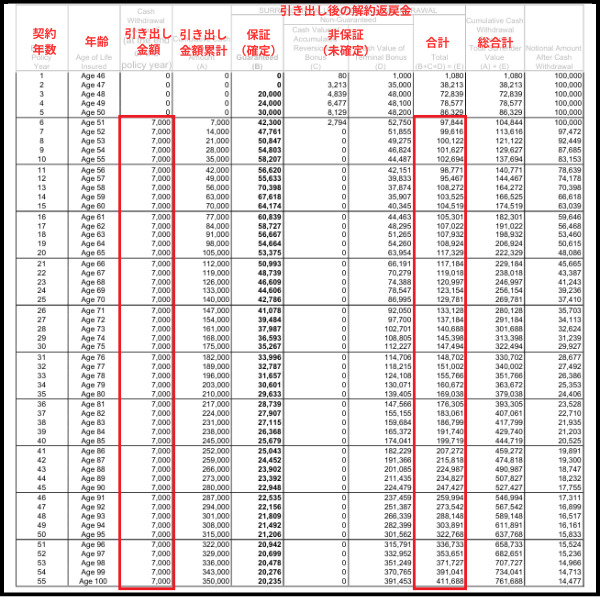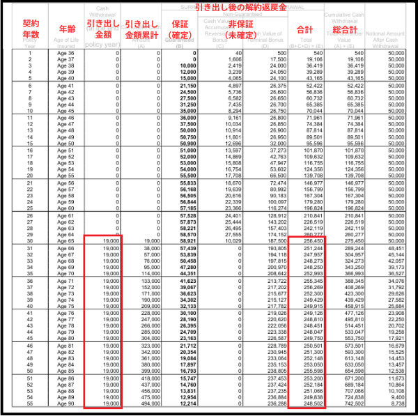 30年経過後の65歳から100歳まで仮に毎年19,000USDずつ引き出し続けたとしても、100歳時点の解約払戻金はまだ243,645USDが残ります。