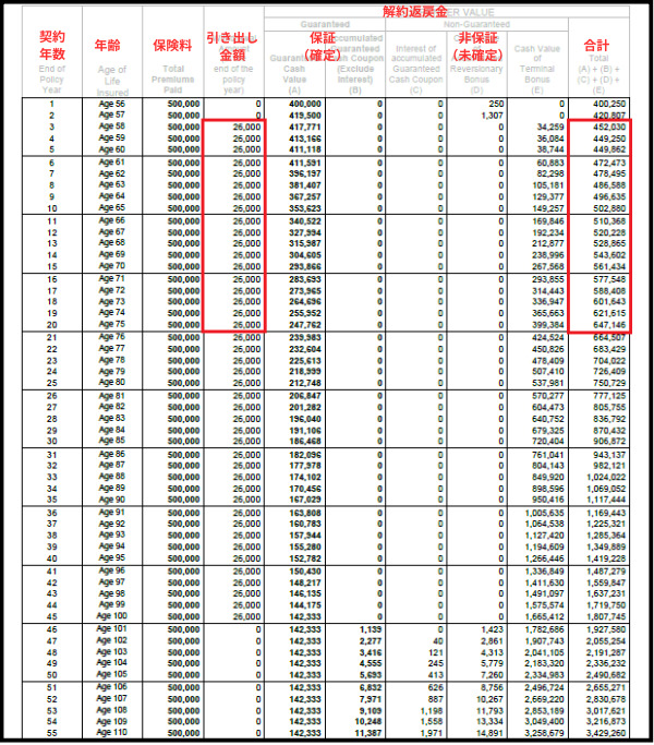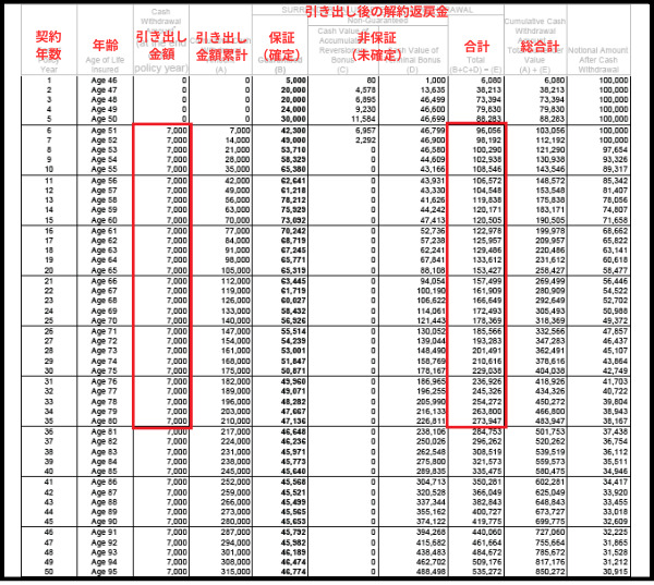 ・6年経過後から保険料総額の7%(毎年7,000USD)を引き出し